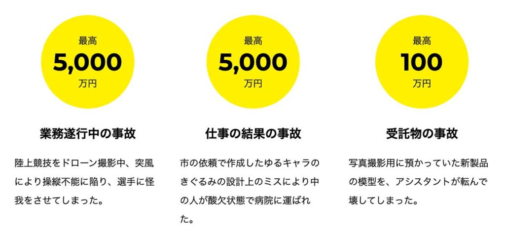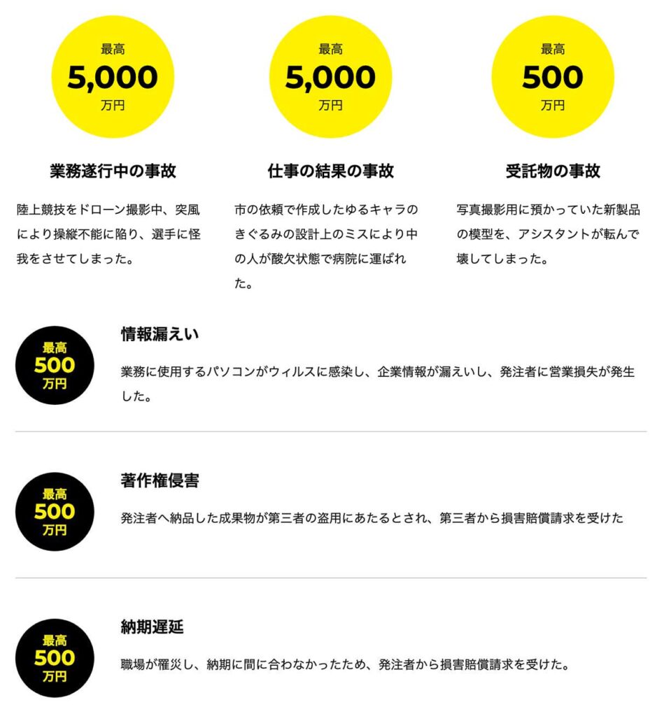 仕事中の事故や納品物のミスを原因とする事故……さらに、情報漏えいや著作権侵害などが原因のフリーランス特有の事故も、わずかな負担で補償してくれます。