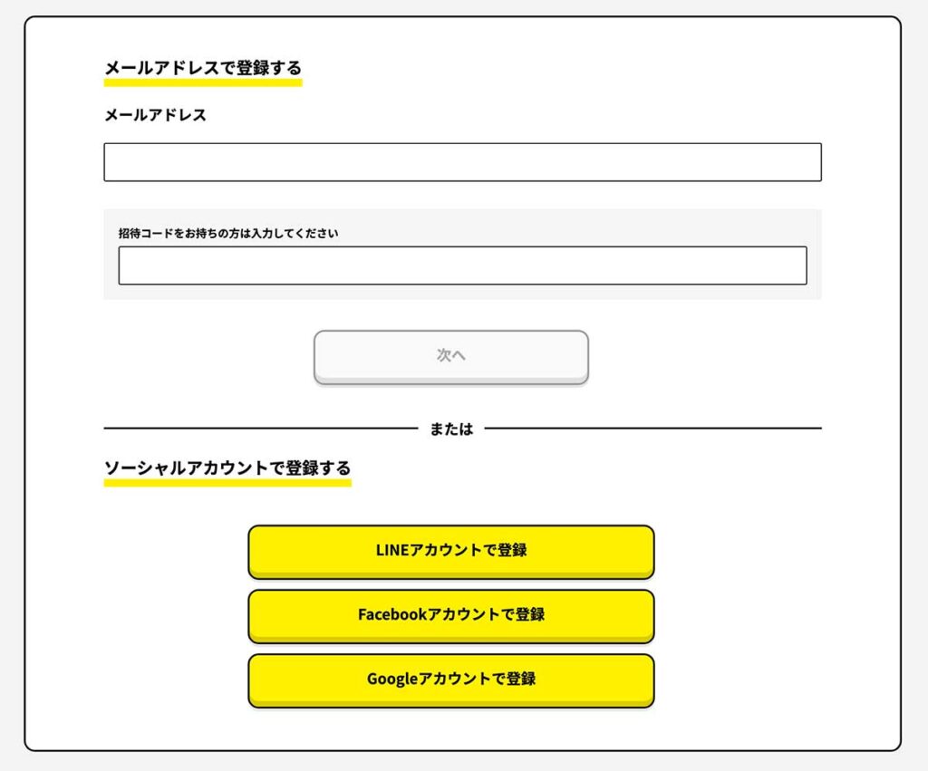 アカウントはメードアドレスまたは、LINE・facebook・Googleのソーシャルアカウントで作ることができます。