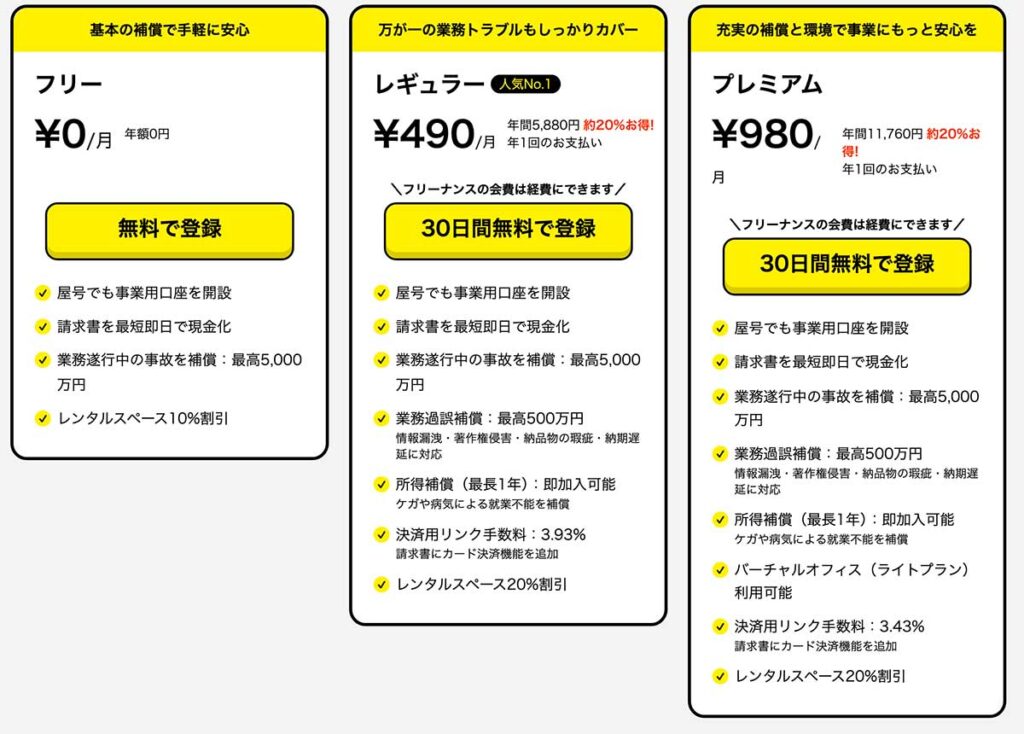 月額料金をアップすることで保険が手厚くなったり、手数料が下がったり、バーチャルオフィスが使えるようになったりとサービス内容が変わってきます。